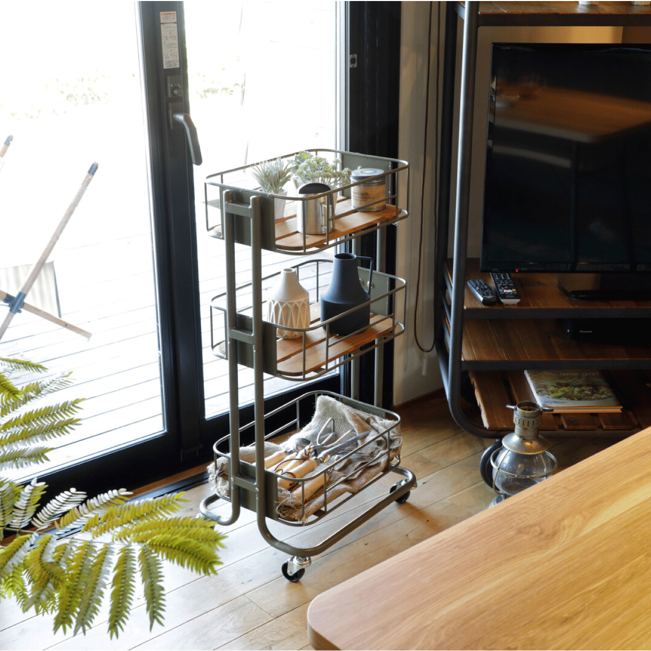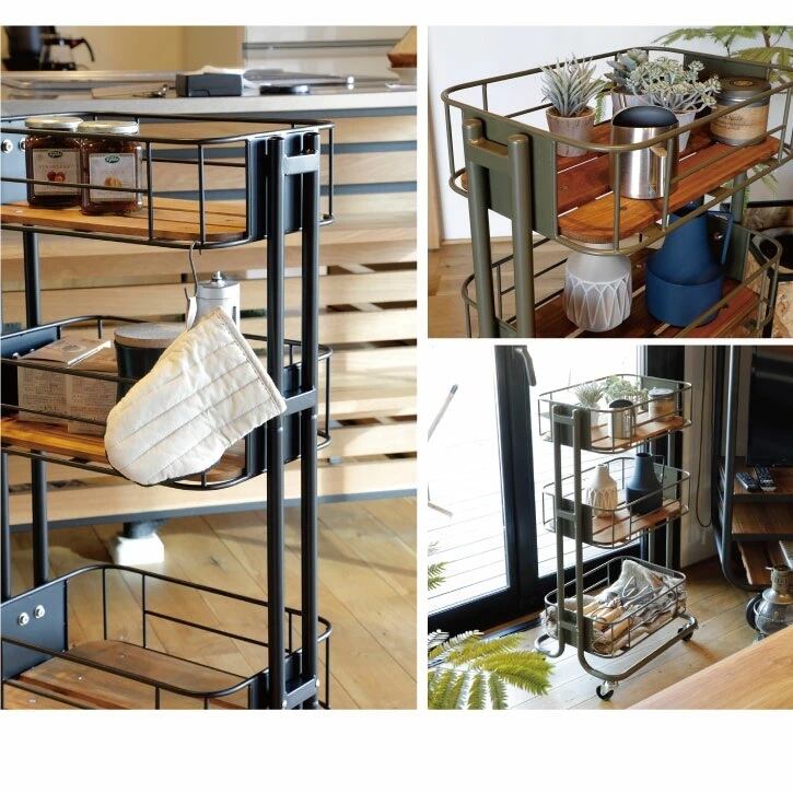 このワゴンは、キッチンでの食器や調味料の収納、リビングでの雑誌やリモコンの整理、デスクサイドでの文具や書類の管理など、多様な場面でお使いいただけます。コンパクトなサイズ感なので、限られたスペースでも大活躍します。